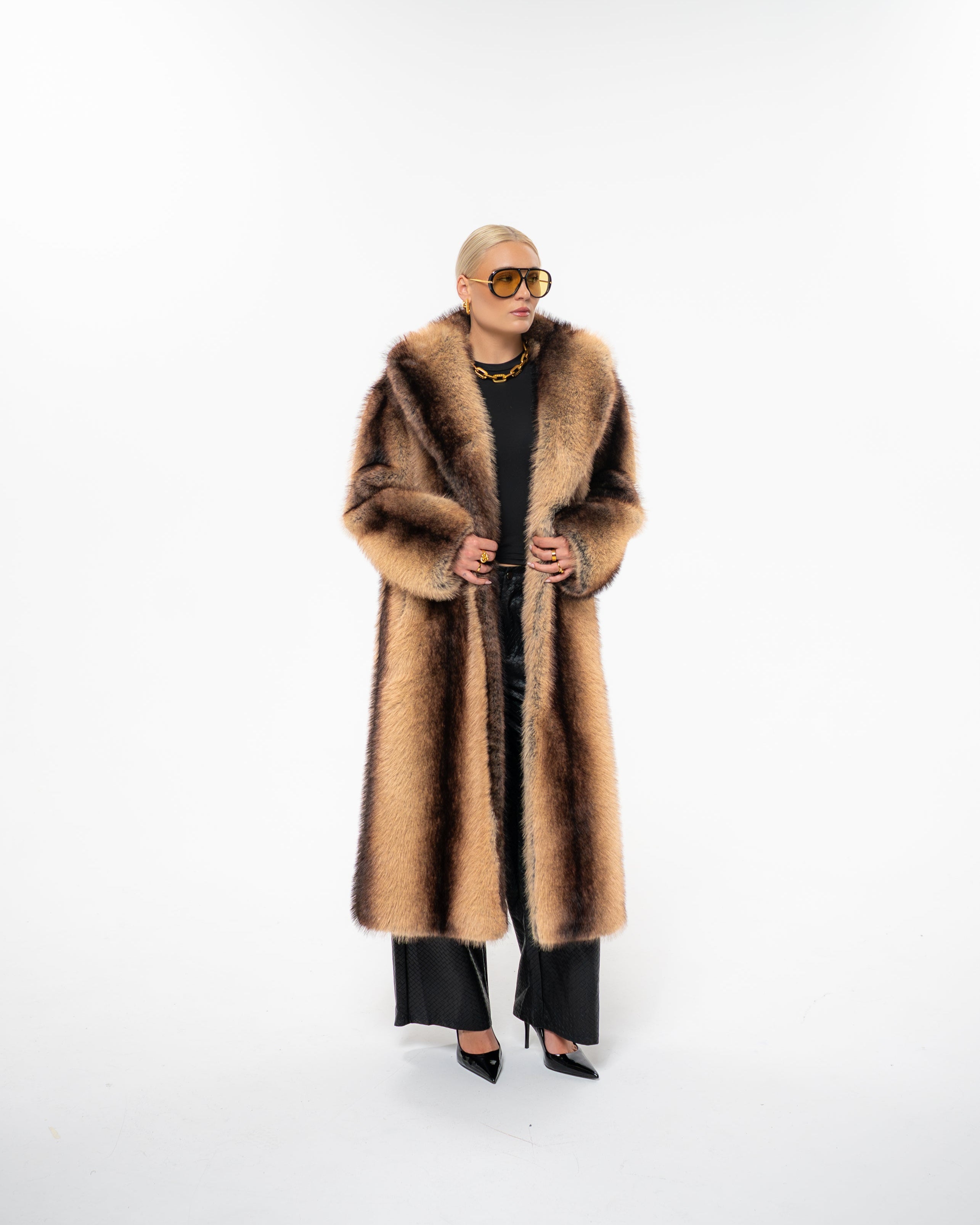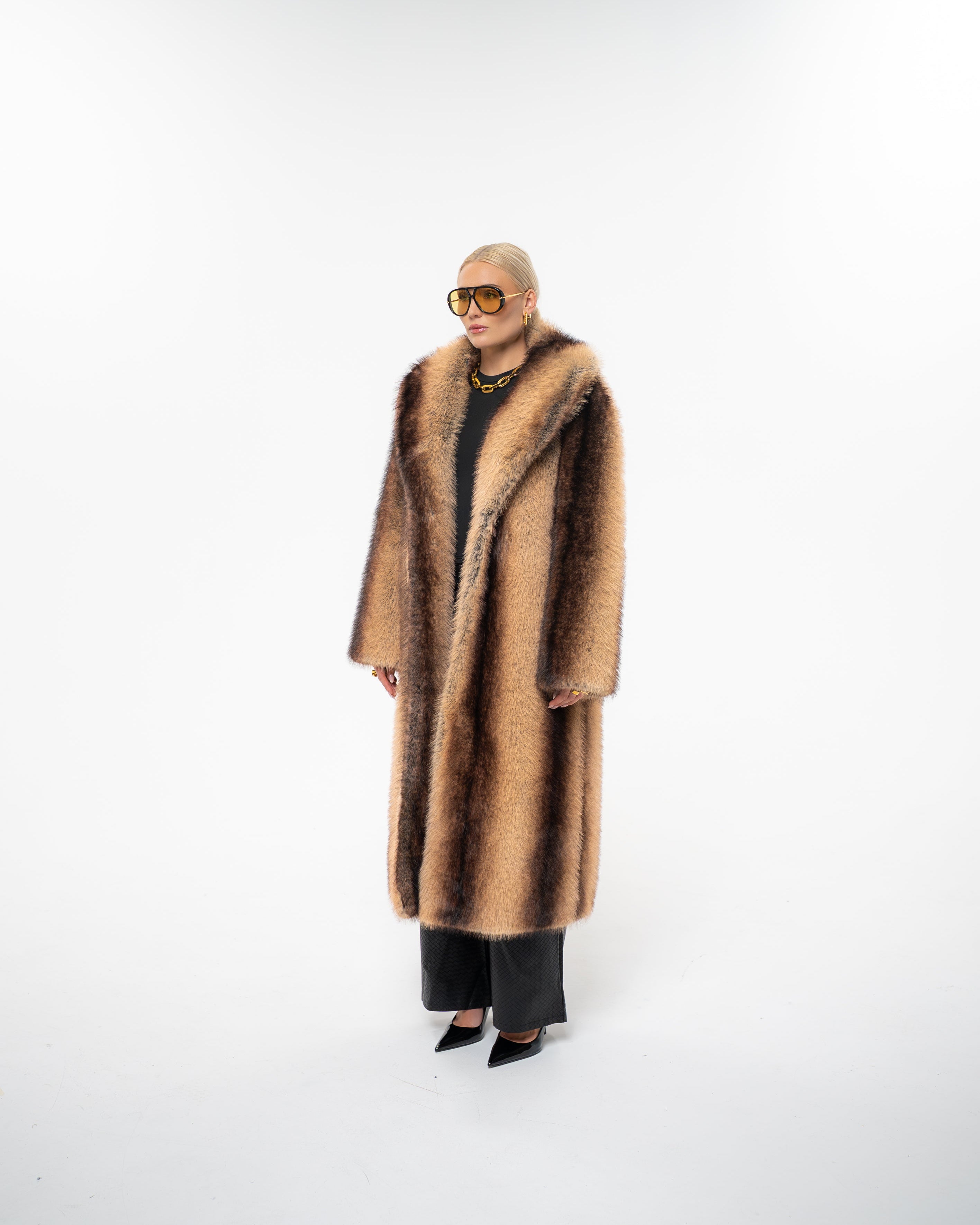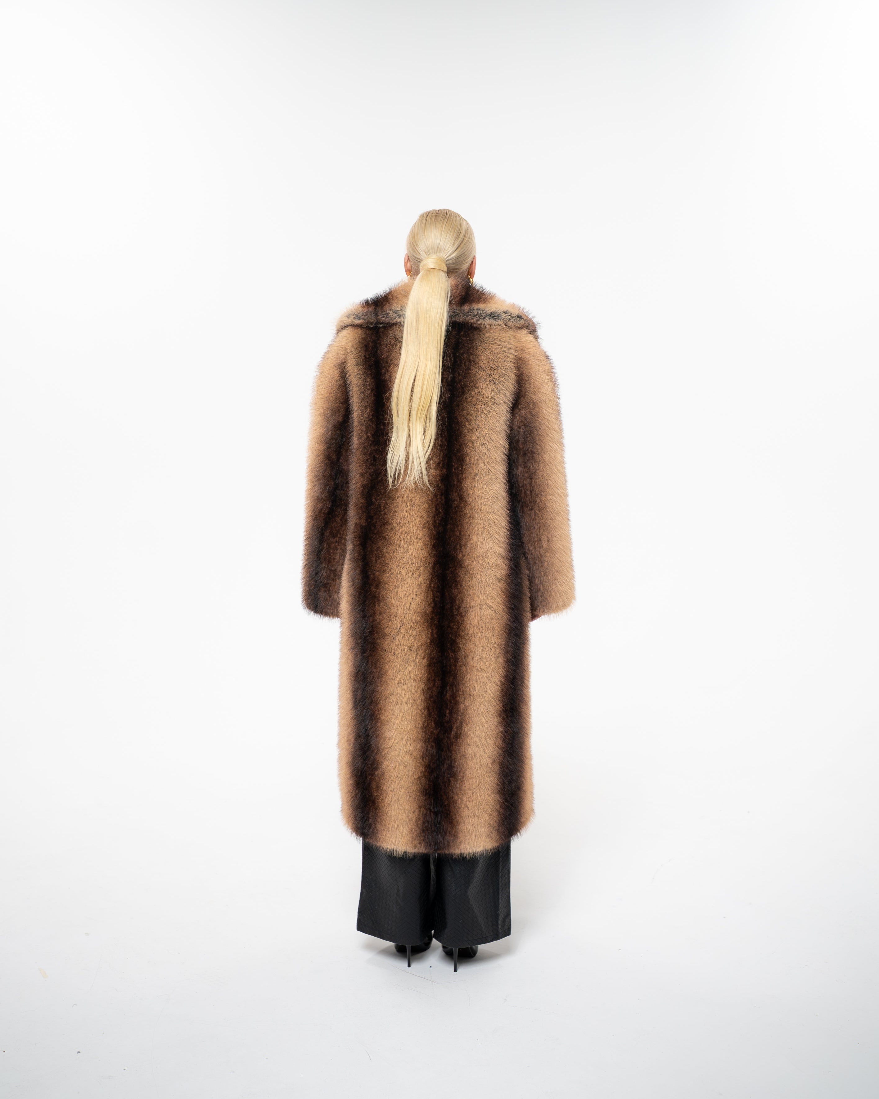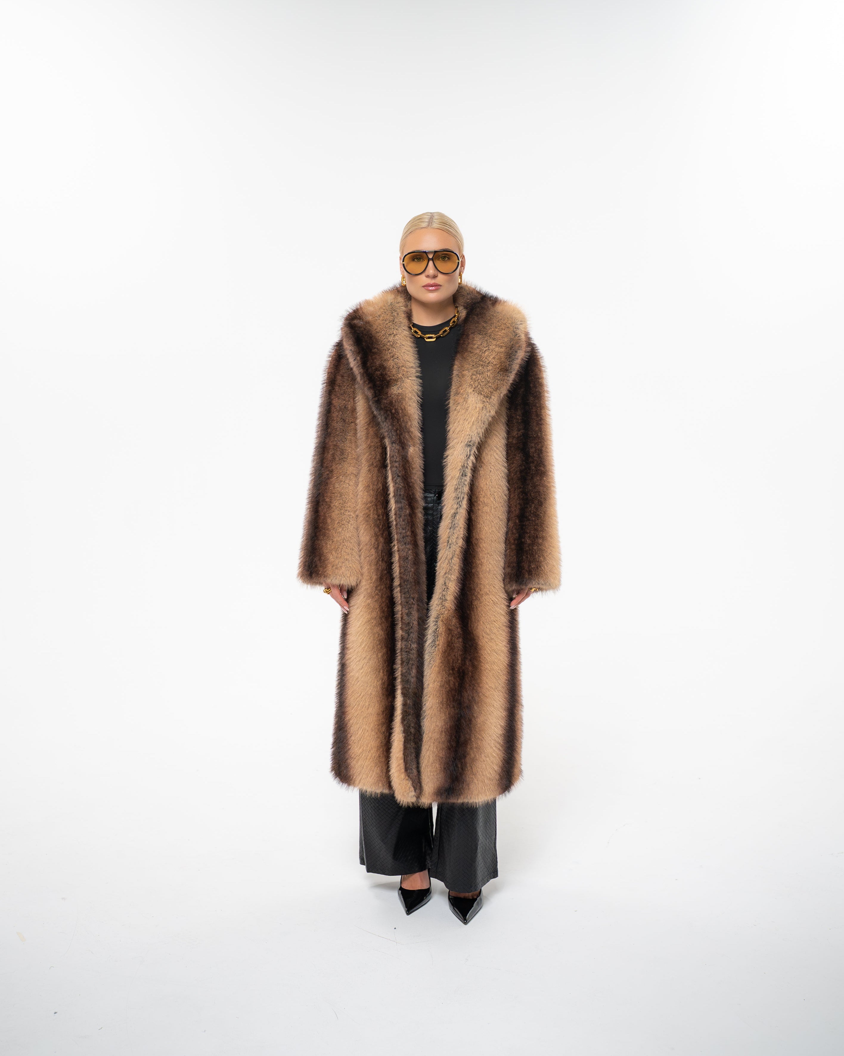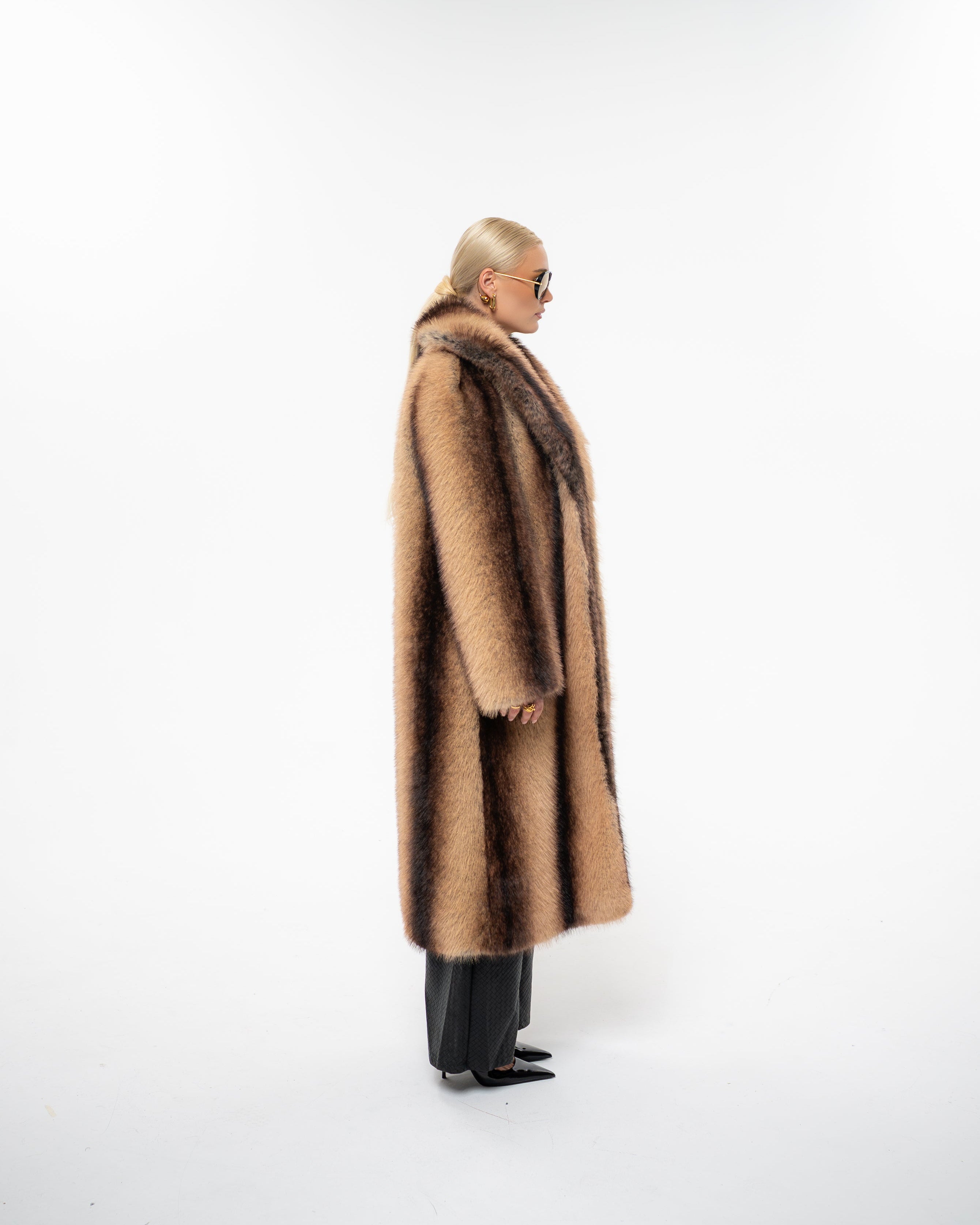 Own the room in the handmade ‘STATEMENT’ coat - a full-length, thick and heavy faux fur masterpiece created to turn heads. It's golden-brown base, streaked with rich chocolate striping, recalls the elegance of natural sable while exuding pure confidence and modern edge.